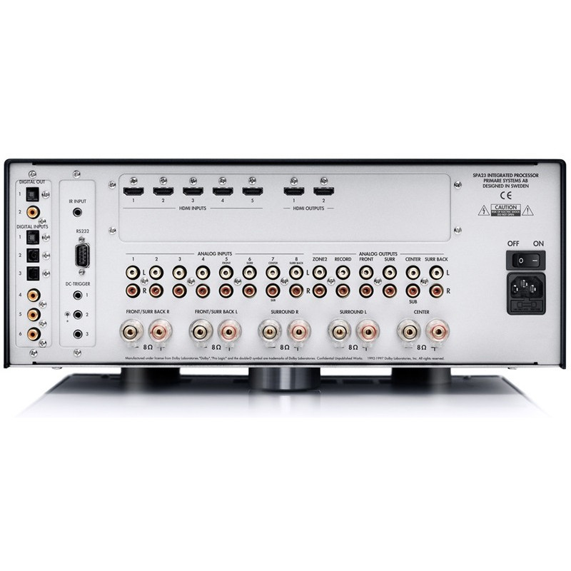 Des entrées audio analogiques 7.1 sont également présentes pour branchement d'un lecteur SACD ou DVD-A par exemple. Des préouts permettent la connexion du Primare SPA23 HDVB à tout type d'amplificateur de puissance, stéréo ou multicanal afin de passer en 7.1. Il offre aussi la possibilité de redistribuer les amplis internes des voies avant principales vers les voies latérales pour une utilisation 7.1. En outre, pour les audiophiles, le Primare SPA23 HDVB propose un mode stéréo ’bypass’ préservant toute la pureté du signal de vos sources stéréo analogiques. Le Primare SPA23 HDVB dispose enfin d’une prise RS232 et de trois prises trigger 12V DC pour s’intégrer dans des systèmes dotés de commandes à distance et automatismes divers.