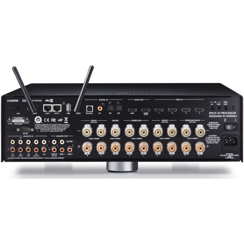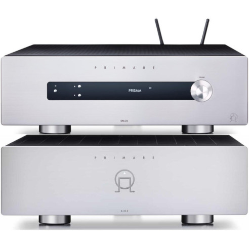 Primare SPA25 Prisma + A35.2 - Ampli Home Cinéma 9.2 + Bloc Stéréo. SPA25 Prisma : 9x 90W RMS sous 8Ω. 2x 145 Watts RMS mode stéréo. 2x 290 Watts RMS mode bi-amplifié. Dolby Atmos®. DTS:X. Dirac Live. Roon Ready. Tidal. eARC. DAC : 2x Sabre ESS 9026PRO. 4x HDMI 2.0 in. 2x HDMI out. 2x Optiques. 1x Coaxial. 2x USB. 5x entrées analogiques RCA, avec entrée multicanal 7.1. 1x Front RCA out. 1x Center Out. 2x Sub. ChromeCast. AirPlay 2. Ethernet. Wifi. BT. Poids: 12 kg. A35.2 : 2x 200 Watts RMS sous 8Ω / 2x 400 Watts RMS sous 4Ω. 1x 800 Watts sous 8Ω. 1x XLR Stéréo. 1x RCA Stéréo. Poids: 11,7 kg