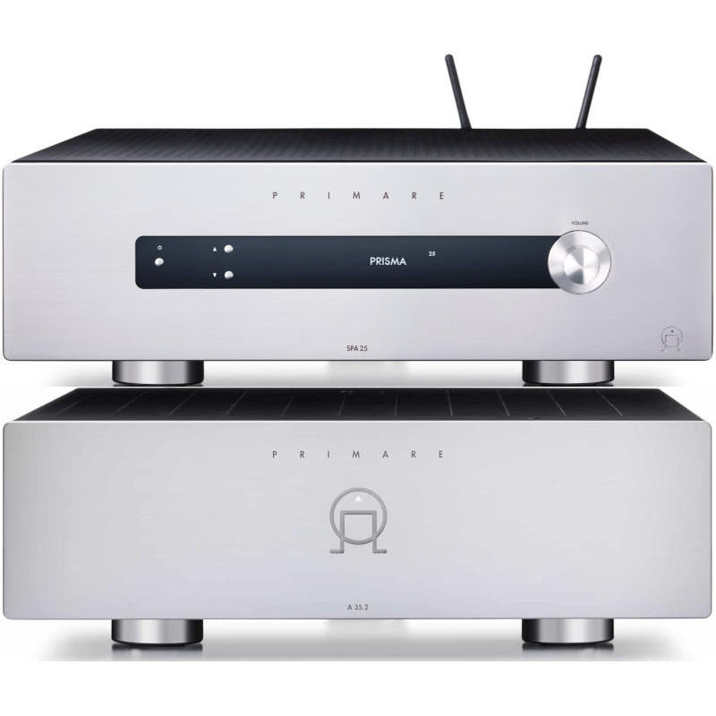 Cet ensemble combine le meilleur du cinéma immersif et de la haute fidélité stéréo. Le Primare SPA25 Prisma est un amplificateur/processeur multicanal de référence, tandis que le bloc de puissance A35.2 vient y ajouter une puissance et un contrôle considérables, permettant des configurations cinéma étendues ou une bi-amplification des enceintes principales sans compromis.