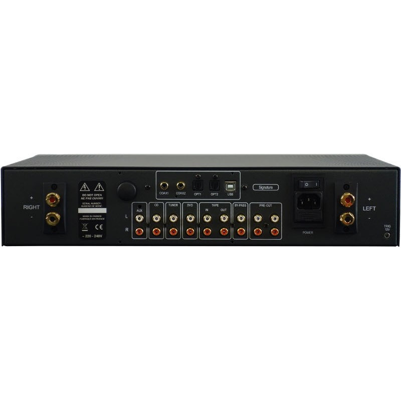 Atoll IN200 Signature - Ampli Stéréo. 2x 120W RMS. 8Ω. 100 dB. 670 VA et 54 500 µF. 5x RCA Stéréo. 1x USB. 2x Optiques. 2x Coaxiale. 1x By-pass. 1x Tape Out. 2x Préout RCA Stéréo. 1x Casque 3,5 mm. Carte Phono en option. Entrée bypass (Home Cinema). Poids : 12 kg
