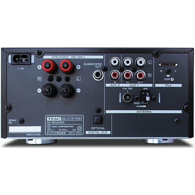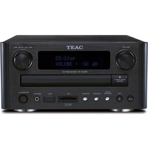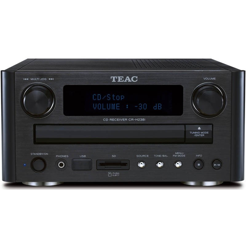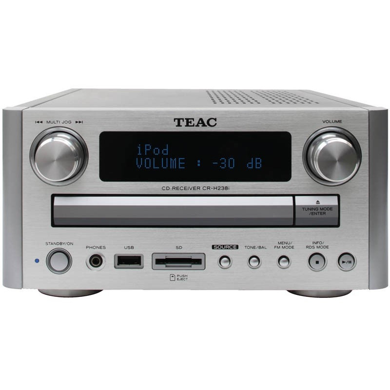 Teac CR-H238i - Mini-chaîne CD & Radio FM, 2x25W (8ohms). 2 paires de RCA dont 1x in/out & Casque (en façade). USB (compatible iPod/iPhone 5ème génération/iPad) & cartes SD. Sortie caisson. Compatible : MP3 et iPod via la station d'acceuil optionnelle Teac DS-22. Poids: 4,2 kg.