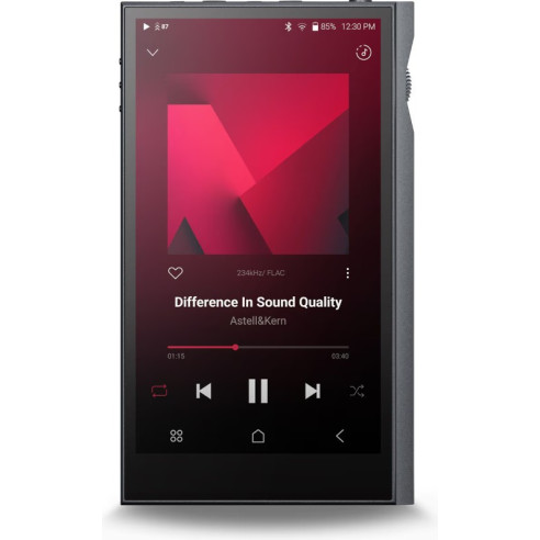 Astell & Kern Kann Ultra - Digital Audio Player. Écran Tactile 1080 x 1920 de 5,5". Châssis Aluminium. Technologie Teraton Alpha, Digital Audio Remaster (DAR), double ampli Class A/AB. Mémoire : 128Go, Extensible via MicroSD jusqu'à 1To. Double Dac ESS Sabre ES9039M PRO. 32 bits / 768 kHz, DSD512. MQA. Bluetooth 5.3 aptX HD & LDAC. 115 dB Asymétrique, 119 dB Asymétrique. Gestion du Gain de 2 Vrms à 8 Vrms en Asymétrique & 4 Vrms à 16 Vrms en Symétrique. Autonomie jusqu'à 11h. Sorties Casques : 1x Asymétrique Mini-Jack 3,5 mm. 1x Symétrique 4,4 mm. Sortie Ligne/Préout : 1x Asymétrique Mini Jack 3,5 mm. 1x Symétrique 4,4 mm. Port de Charge USB-C. Wifi. Roon Ready. Qobuz. Tidal. Spotify. Deezer. Poids: 390 gr