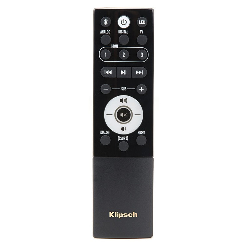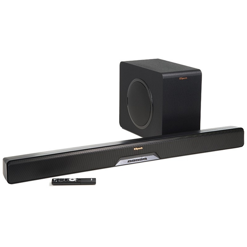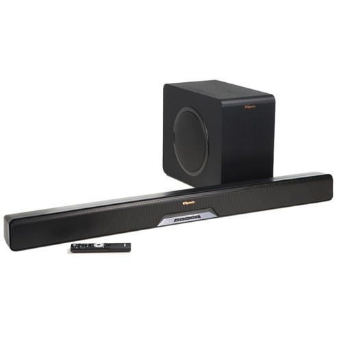 Klipsch RSB-11 - Barre de son 2.1. 135 W. 110 dB. 28 Hz - 15 kHz. 2x Tweeters de 19 mm dans Pavillon Tractrix 90°/90°. 4x Médiums en Fibre de Composite de 63,5 mm. 1x Subwoofer en Fibre de composite de 203 mm. BlueTooth. 4x HDMI 2.0. 1x Optique. 1x Mini-Jack 3,5 mm. Poids: 15,43 kg