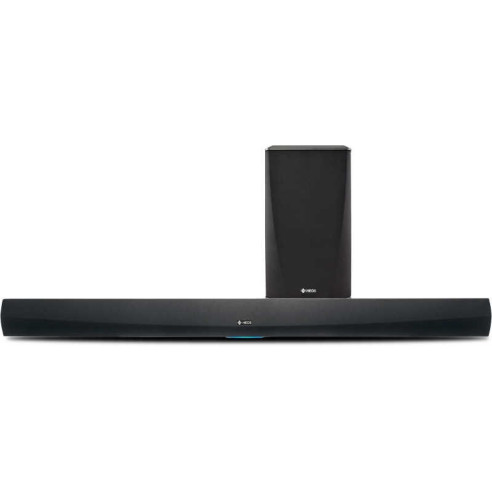 Denon HEOS HomeCinema HS2 - Barre de Son 2.1. Barre : 2x Tweeters de 20 mm. 2x Graves à Membrane Kevlar de 133 mm. 2x Ampli Classe D. 2x HDMI. Optique. Coaxial. WiFi. Ethernet. USB. Caisson : Sans Fil. 2x Subwoofers de 135 mm. Poids : 9,4 kg Total.