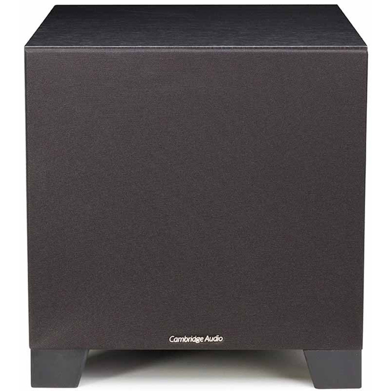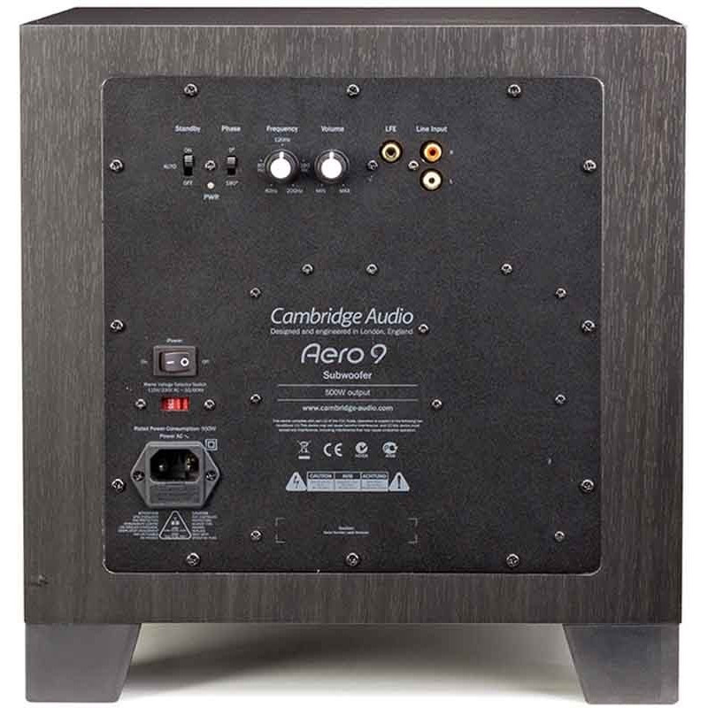 Cambridge Aero 9 - Caisson de basses. 1x HP Actif en façade de 25cm + 1x HP Passif au sol de 25cm. Réponse en fréquence : 21 - 200 Hz. Coupure : 40 - 200 Hz. Phase : 0 à 180°. Puissance : 500W. Entrée LFE et RCA Stéréo. Poids : 11,7kg.