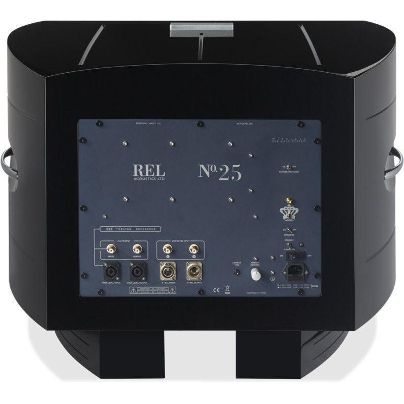 REL Acoustics N°25 - Caisson de Basses. 1x Haut-parleur en Fibre de Carbone de 38cm. Descend à 15 Hz -6 dB. Ampli Classe D Next Gen III 1000W RMS. récepteur sans fils Longbow™. Entrées: 1x Speakon. 1x XLR Stéréo. 1x RCA stéréo. 1x LFE. Poids: 76 kg.