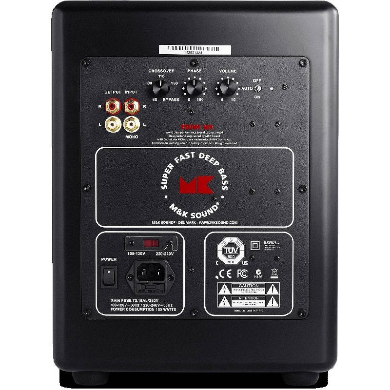 Un commutateur permet au M&K Sound V8 d'opter pour une mise en veille automatique, l'arrêt ou la mise en route du caisson. Un potentiomètre permet d'ajuster la phase entre 0 et 180 degrés et de même, la fréquence de coupure est réglable.