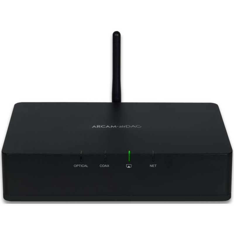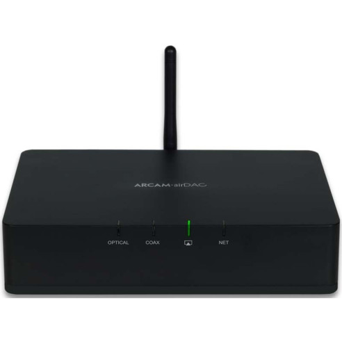 Arcam airDAC - DAC AirPlay sans fil WIFI. Convertisseur TI PCM5102 24bit/192kHz. 106dB. Entrées: 1x Coaxial. 1x Optique. 1x RJ45 Ethernet. Sorties: 1x RCA Stéréo & 1x Coaxial. Compatible: iPhone, iPod touch, iPad. Poids: 1,1kg.