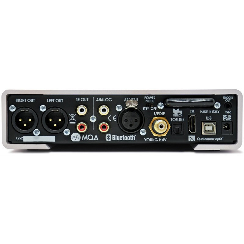 M2tech Young MKIV - Convertisseur / Préampli Phono. 32 bits / 768 kHz. Native DSD 512. 122 dBA. Bluetooth. 1x i2S. 1x AES EBU. 1x USB. 1x Optique. 1x Coaxial. 1x Sortie XLR. 1x Sortie RCA Stéréo. Poids: 2 kg