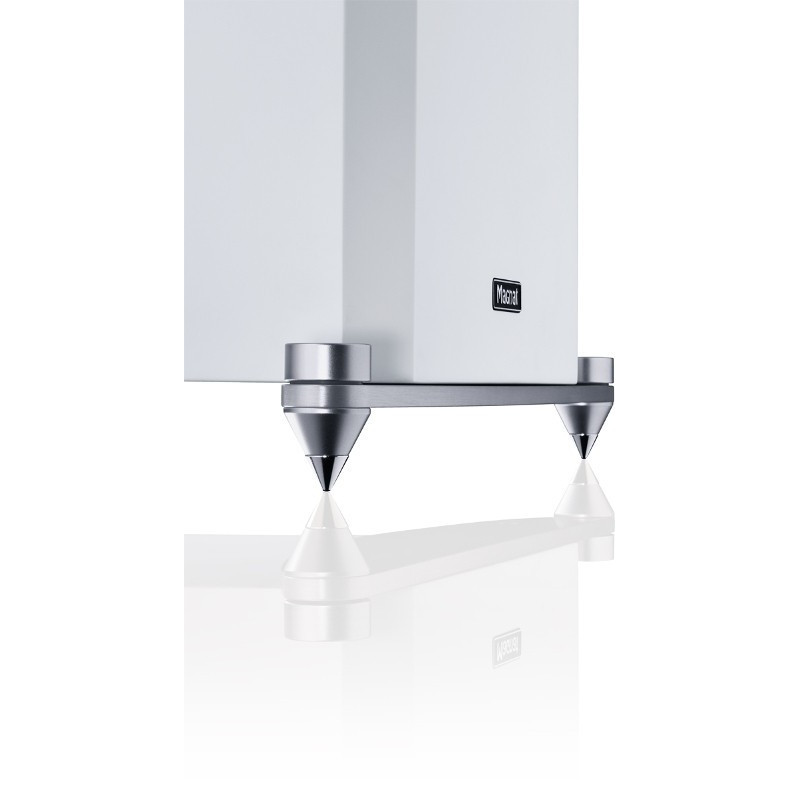 Des traverses de piètement en aluminium massif ainsi que des pointes en métail réglable en hauteur soulignent les exigences de qualité exceptionnellement élevées de ces enceintes.
