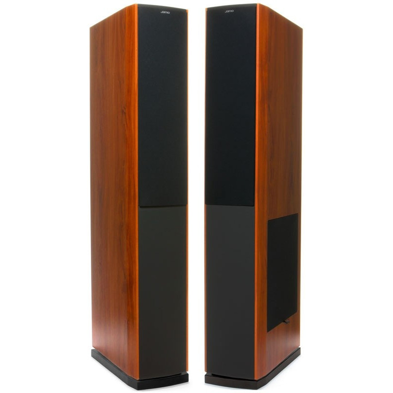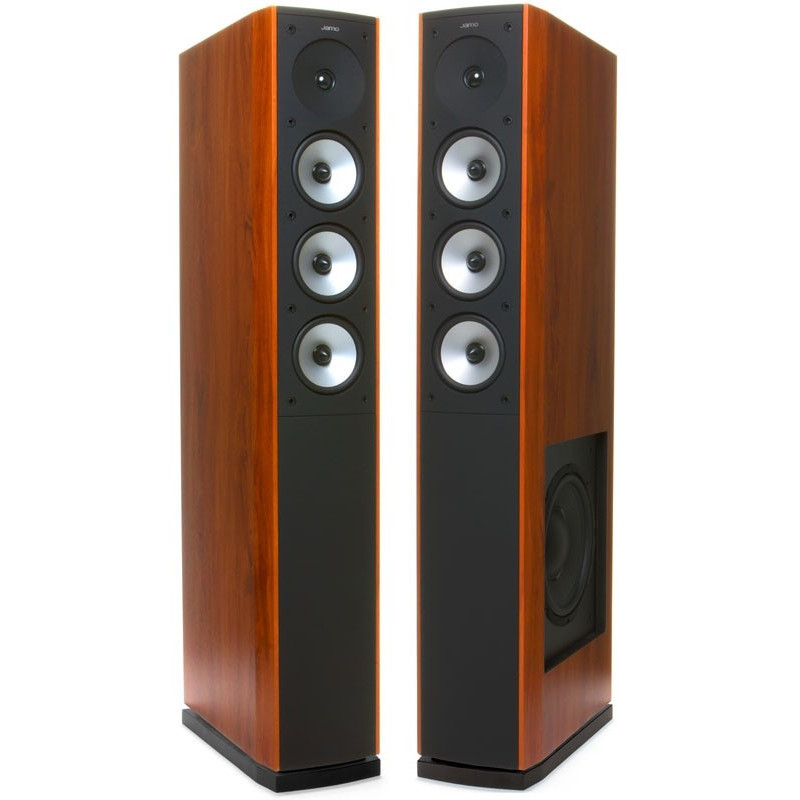 Jamo S628 - Enceintes colonnes 3 voies 5 haut-parleurs Bass-reflex, 1x Tweeter dôme souple 25mm + 3x Medium/Grave 127mm cône aluminium + 1x Grave 254mm sur le coté, 150W, 37Hz-20kHz, 90dB. 6ohms. Poids: 25,5kg pièce. Finition: Dark Apple ou Noir.