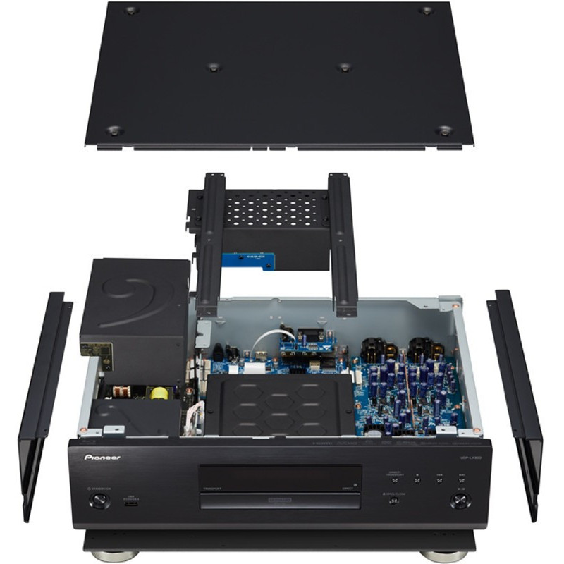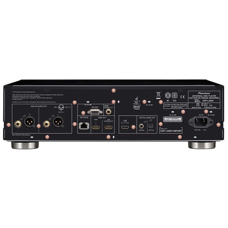 Pioneer UDP-LX800 AUDIOCOM Cinema Edition - Lecteur Blu-Ray. Multi-Région. UHD. HDR. Dolby Vision. Horloge Système Femtoseconde. DAC ES9026 PRO. SACD. BR Audio. 2x HDMI 2.0. 2x USB. 1x Optique. 2x Coaxiales dont 1 Zero Signal. 1x XLR Stéréo. 1x RCA Stéréo. Ethernet. Poids: 13,9 kg