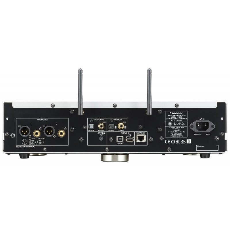 Pioneer N-70AE - Lecteur Réseau. ESS Sabre ES9026. 32 bits / 384 kHz. DSD256. Écran LCD 3,5". ChromeCast. AirPlay. FireConnect. Spotify. Deezer. Tidal. etc... 2x Optiques. 2x Coaxiales. 1x XLR Stéréo. 1x RCA Stéréo. 3x USB. Ethernet. Wifi. Poids: 11,4 kg
