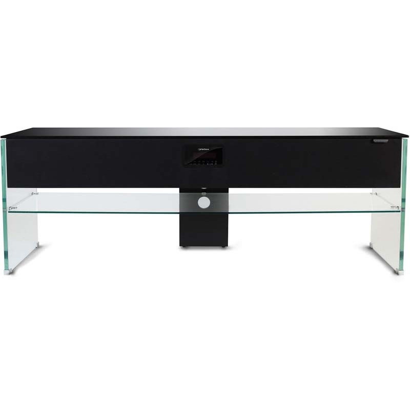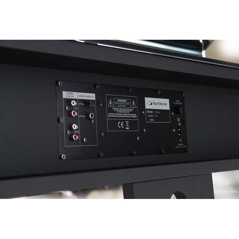 Norstone Scala - Meuble TV avec Système 2.1. Structure MDF, pieds en verre trempé. Charge : 50 kg (supérieur), 15 kg (tablette). Barre de son : 2x Tweeters de 25 mm. 2x Médiums de 75 mm. 1x Woofer de 165mm. 2x 15 W RMS 1x 35 W RMS. Bluetooth. 1x Optique. 1x Coaxial. 1x Jack 3,5 mm. Poids : 33,5 kg