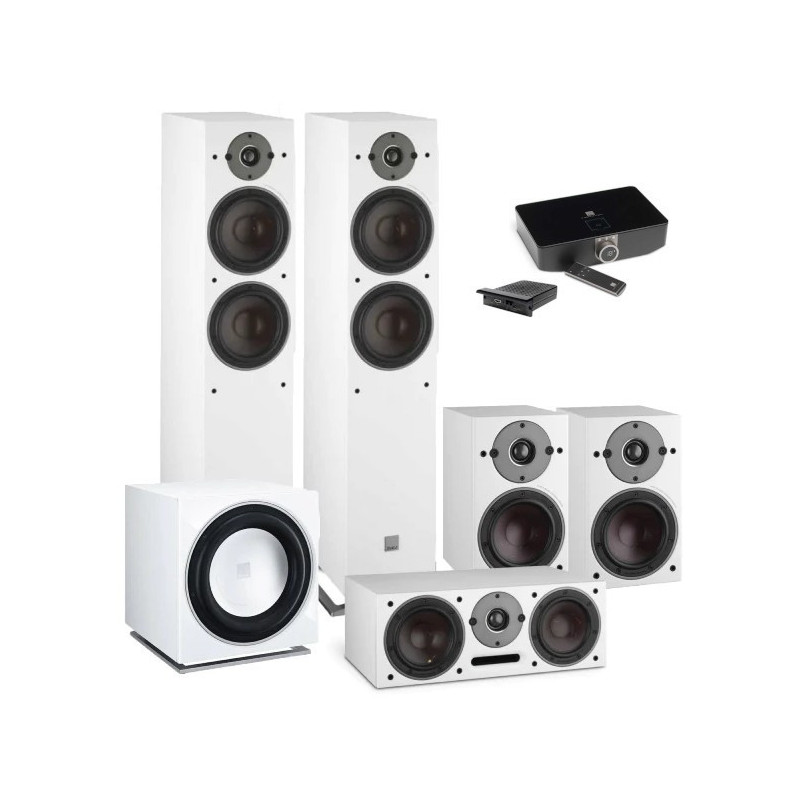 Dali Oberon C System 5.1 - Ensemble Home Cinéma Sans Fil. Enceintes : 1x Paire de Dali Oberon 7C. 1x Paire de Dali Oberon 1C + 1x Dali Oberon Vokal C. 1x Dali SUB E12 F. Préampli : Dali Sound Hub + Module HDMI : Liaison sans fil 5,8 GHz. Convertisseur 24 bits / 192 kHz. Bluetooth aptX. BluOS NPM-2i inclus 2x Optiques. 1x Coaxial. 1x RCA Stéréo. 1x 1x AUX Mini-Jack 3,5 mm. Dali Dongle WSR : Signal Wifi sans perte. 1x Sortie Sub. 1x USB alimentation