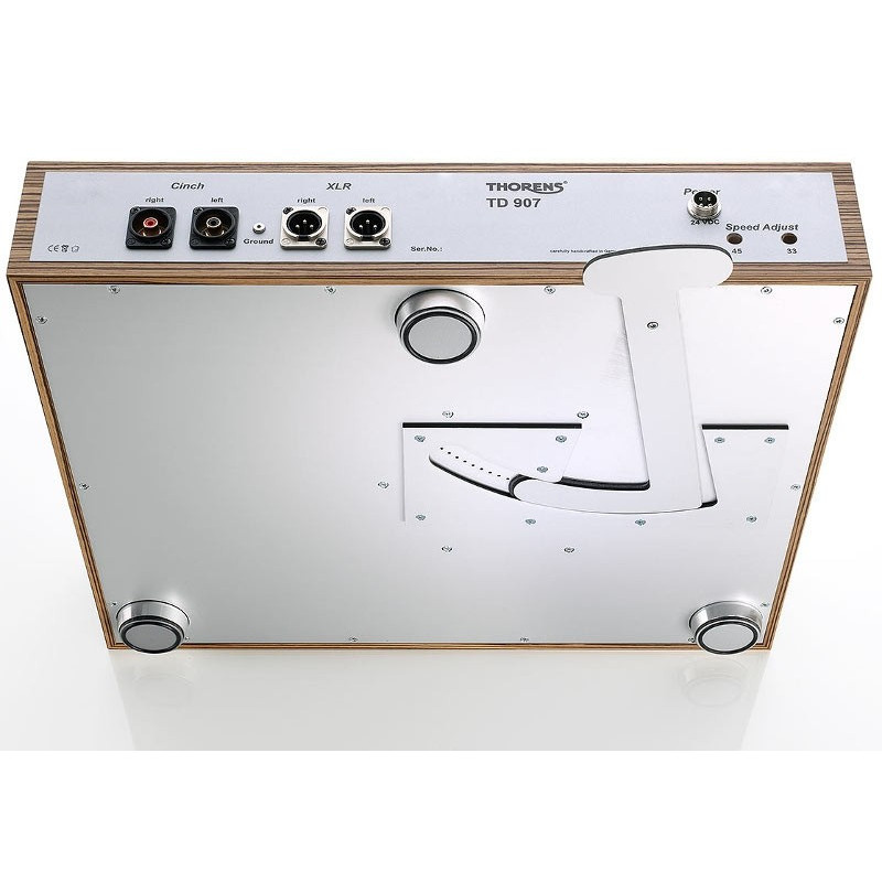 Thorens TD 907 - Platine Vinyle. Bras TP 92. Cellule non fourni. Châssis TriCom. Entraînement par Courroie. 33 1/3 & 45 tours/min. Contrôle de Vitesse Électrique. Plateau Acrylique de 6,5 kg. Alimentation Externe. 1x XLR Stéréo. 1x RCA Stéréo. Poids: 12 kg