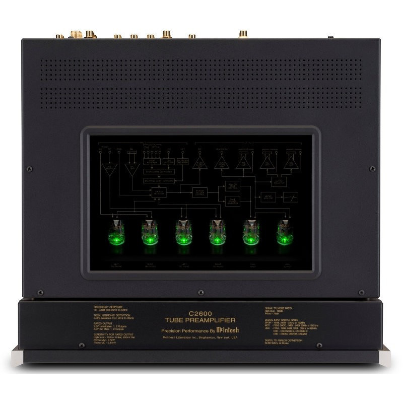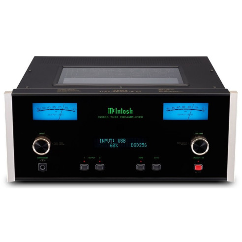 McIntosh C2600 - Préampli Stéréo à Tube. 20 Hz - 20 kHz (-0.5 dB) / 15 Hz - 100 kHz (-3 dB). 100 dB. Convertisseur N/A 32 bits / 384 kHz. DSD & DXD. 3x XLR Stéréo. 4x RCA Stéréo. 2x Phono. 3x RCA Out. 3x XLR Out. 3x Optiques. 2x Coaxiales. 1x USB. 1x MCT. Poids : 13,4 kg.
