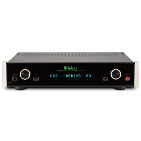 McIntosh D150 - Préampli Digital Stéréo. 4 Hz - 68 kHz (-3 dB). 110 dB. Convertisseur N/A 32 bits / 384 kHz. DSD 64/128 & DXD 352.8/384 kHz. 2x XLR Stéréo. 2x RCA Stéréo. 2x Optiques. 2x Coaxiales. 1x USB. 1x DIN. Poids : 6,1 kg.