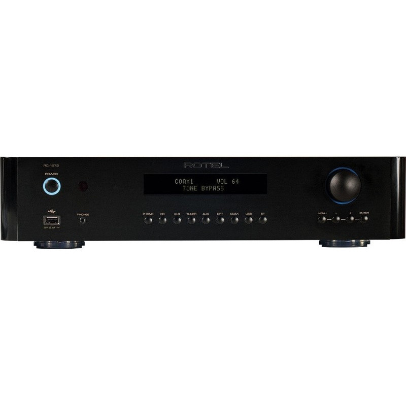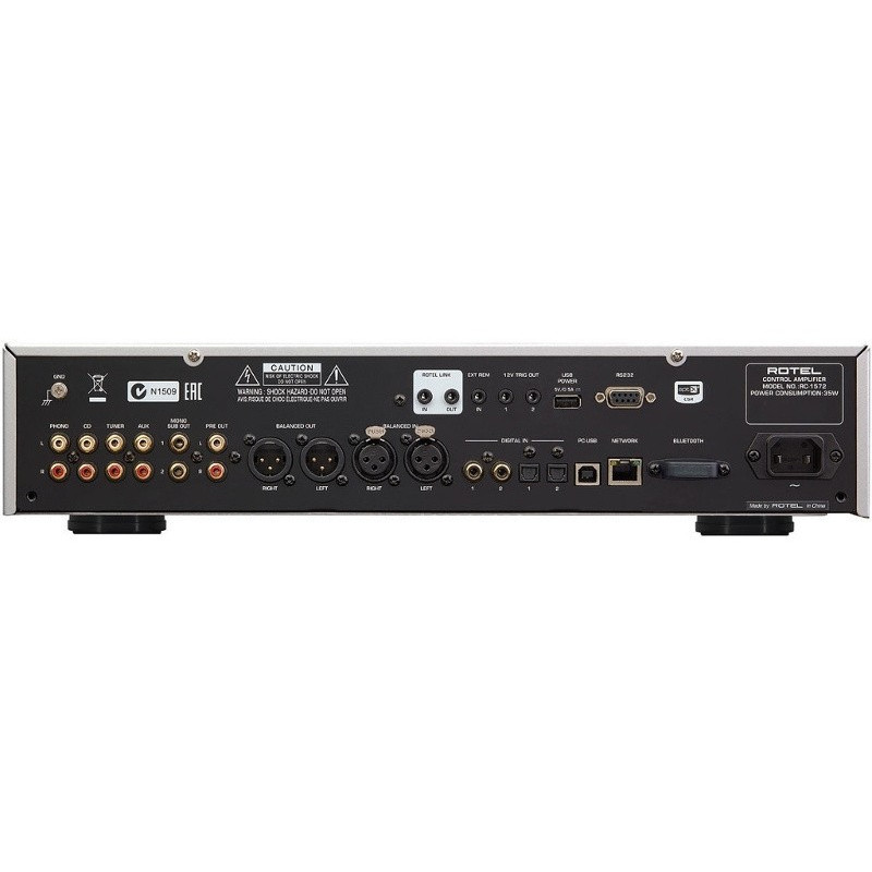 Une fonction Bluetooth au format aptX est aussi intégrée. Les entrées analogiques comportent des connecteurs de type XLR symétriques, parfaits pour relier les sorties XLR du Rotel RCD-1572, auxquelles s’ajoutent quatre paires d'entrées RCA conventionnelles. Une entrée phono pour cellule à aimant mobile vient compléter toutes ces sources. Les sorties sont de type symétrique XLR ou asymétriques, ainsi qu’une sortie mono pour caisson de graves et deux triggers 12 volts permettant de commander l'activation / désactivation d'un amplificateur externe ou d'autres éléments audio. Pour une parfaite intégration dans un système domotique connecté, on dispose du pilotage par RS232 sur connecteur DB9 standard, ainsi que d'un port Ethernet offrant le contrôle par IP et les mises à jour logicielles.
