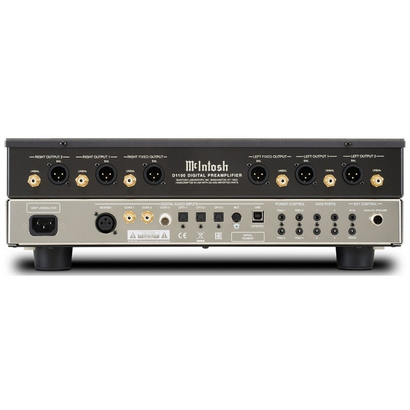 McIntosh D1100 - Préampli Stéréo Numérique. 111 dB. Convertisseur N/A 32 bits / 384 kHz. DSD 64/128/256 & DXD 352,8/384 kHz. Entrées : 1x AES/EBU. 3x Optiques. 2x Coaxiales. 1x USB. Sorties : 3x XLR Stéréo. 3x RCA Stéréo. Poids : 11,8 kg. Utilisable avec le Mc Intosh C1100C.