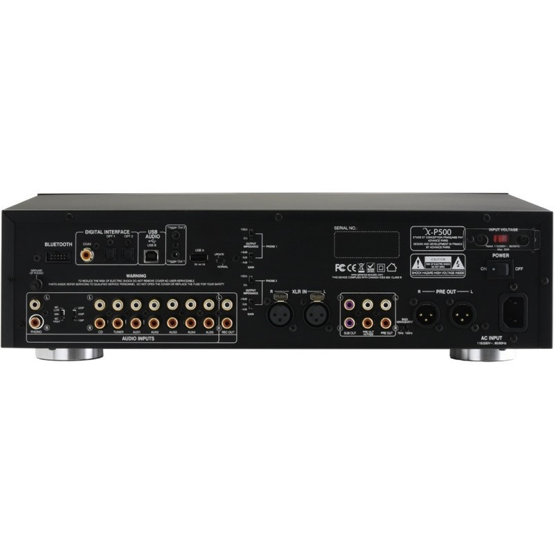 Advance Paris XP-500 - Préampli Stéréo. 20 Hz - 45 kHz. 100 dB. Convertisseur Wolfson WM8742. 24 bits / 192 kHz. . Bluetooth (option). 1x Phono. 1x XLR Stéréo. 7x RCA Stéréo. 2x USB. 2x Optiques. 1x Coaxial. 1x XLR Stéréo Out. 1x RCA Stéréo Out. 2x Préout. 2x Sub. Poids: 6,56 kg.