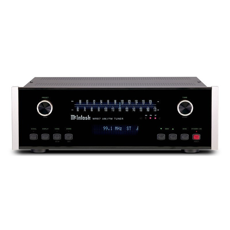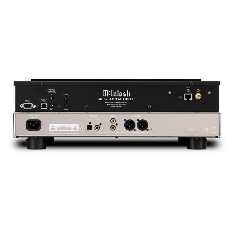 McIntosh MR87 - Tuner AM/FM. 20 Stations programmable. AM: 522kHz - 1602kHz, FM: 87.5MHz - 108.0MHz. 1x XLR Stéréo. 1x RCA Stéréo. 1x Optique. 1x Coaxial. 1x Ethernet (pour antenne AM RAA2 de McIntosh fourni). Poids : 11,3 kg.